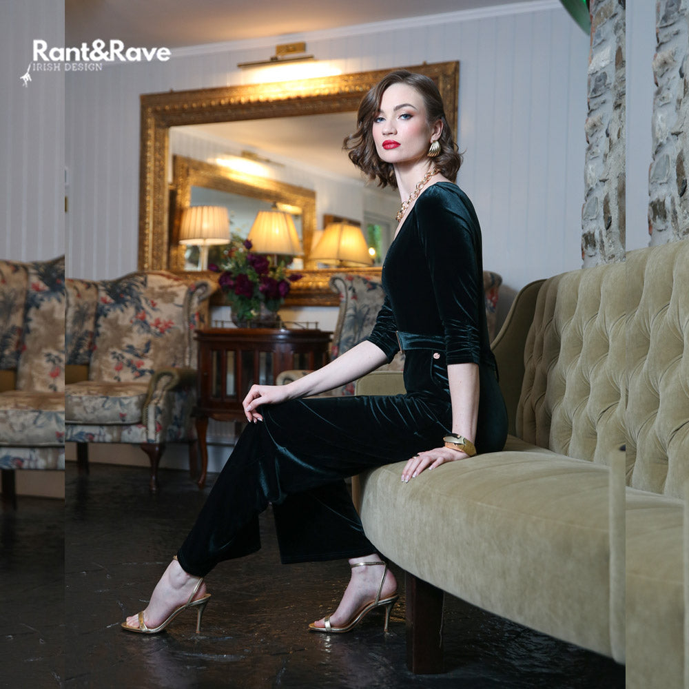 Turn heads this season with the Rant and Rave Farrah Jumpsuit in Green — a stunning blend of sophistication and comfort. Crafted from luxurious velvet, this jumpsuit features a flattering V-neckline, soft draped sleeves, and a belted waist that cinches beautifully for a defined silhouette.